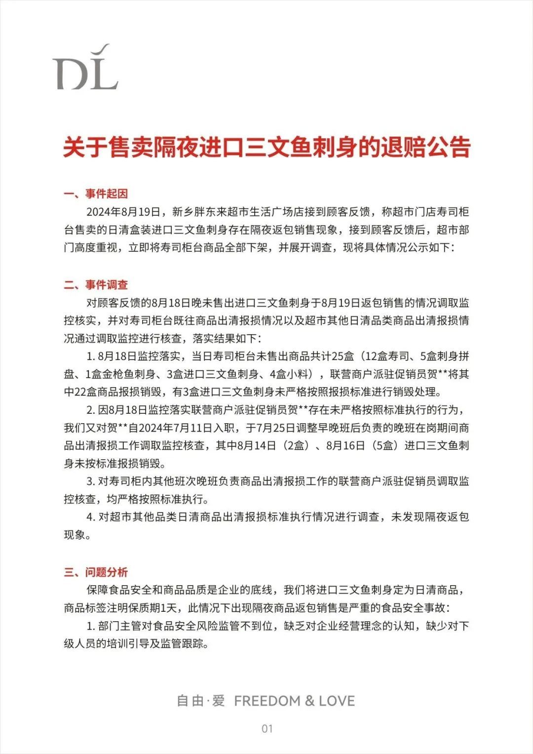 8月24日,胖东来发布关于售卖隔夜进口三文鱼刺身的退赔公告:2024年8月19日,新乡胖东来超市生活广场店接到顾客反馈,称超市门店寿司柜台售卖的日清盒装进口三文鱼刺身存在隔夜返包销售现象,接到顾客反馈后,超市部门高度重视,即将寿司柜台商品全部下架,并展开调查。事件系工作人员未严格按照报损标准进行销毁处理。