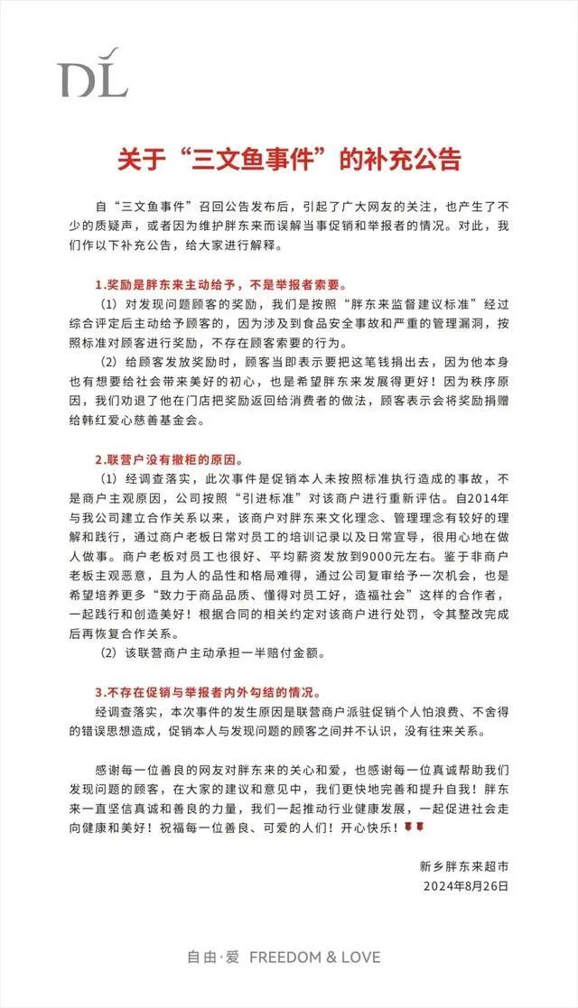 同时,对发现问题顾客的奖励,是按照“胖东来监督建议标准”经过综合评定后主动给予顾客的,因为涉及到食品安全事故和严重的管理漏洞,按照标准对顾客进行奖励,不存在顾客索要的行为。顾客最后决定将奖励捐献给韩红爱心慈善基金会。对于涉事的联营商户,胖东来则表示不是商户主观原因,该商户主动承担一半的赔付金额。