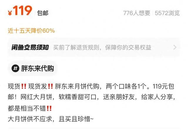 日前,胖东来月饼再一次迎来抢购热潮。旗下自营月饼被黄牛在淘宝等互联网平台高价出售,原价29.8元的大月饼最高可被卖到119元。