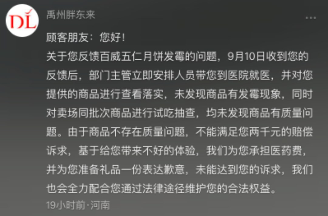 9月13日,胖东来禹州店官方账号在评论区回复称,未发现有质量问题,不能满足该顾客2000元的赔偿诉求。